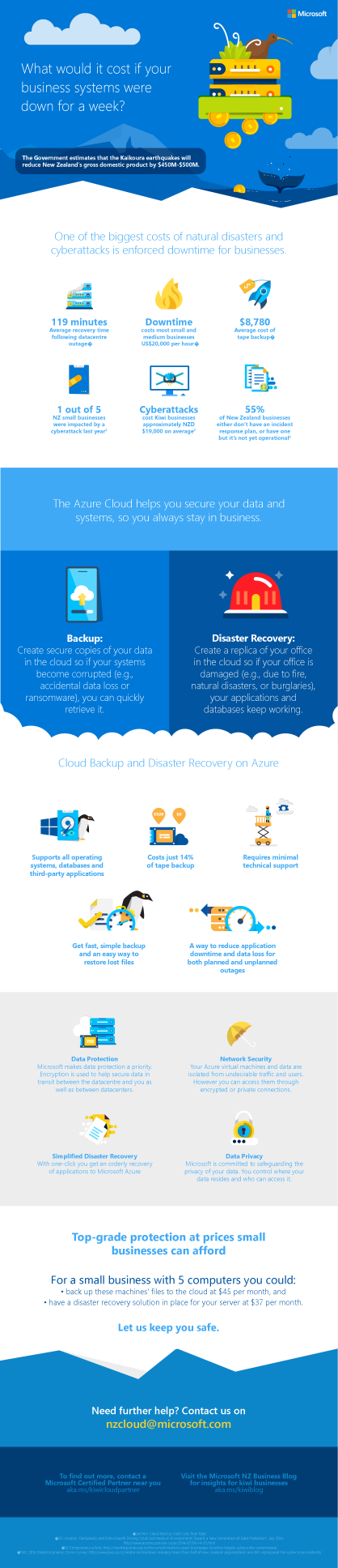 The infographics had to clearly communicate essential information about the Microsoft Azure product as a backup and recovery tool in a manner that would ring true with small and medium businesses in New Zealand.